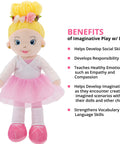 Ready for excitement, and adventure, let Ballerina Eimmie become your child's new best friend. Our 14 Inch Ballerina rag doll is the perfect size for small hands and features blond hair done up in a ballerina bun and beautiful blue eyes. Her embroidered facial features make this doll safe for your little ones, with no small parts coming loose. Ballerina Eimmie comes dressed in a pink leotard, a white wrap-shirt, pink tights, white legwarmers, and a pink tutu. Her matching pink ballerina slippers, floral headband, and embroidered earrings complete her stage-ready ensemble. As soft as she is cute, she is ready to be hugged close and join in on the fun where ever your little one may go. With a wide cast of exclusive characters available from Playtime by Eimmie and Sharewood Forest Friends, our goal is to inspire your children to develop their imagination and cultivate their creativity with play. Clothing is not removable. Spot clean only.